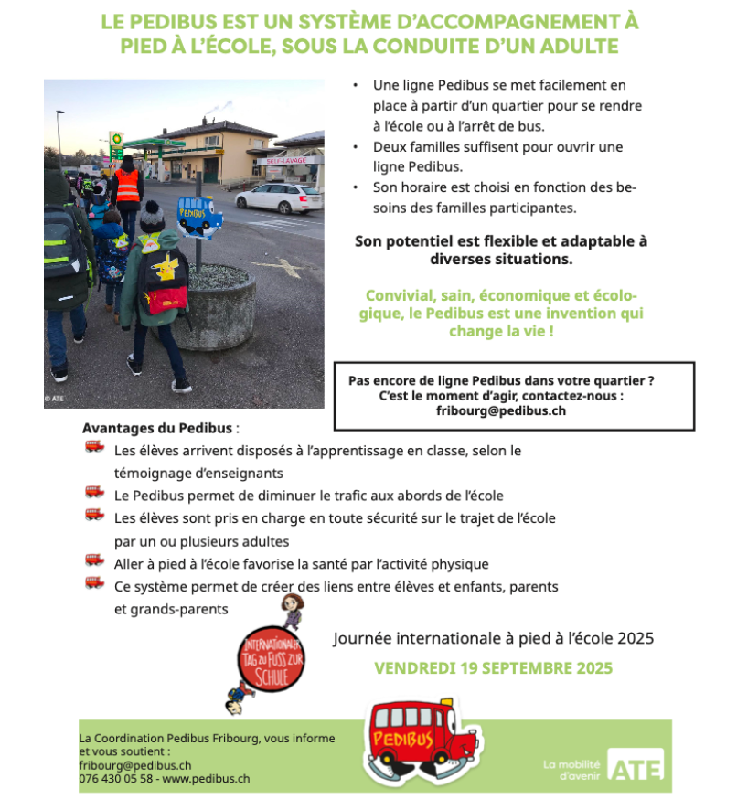 La Coordination Pedibus Fribourg se tient à disposition pour vous renseigner et vous soutenir dans la création de ligne pédibus : www.pedibus.ch