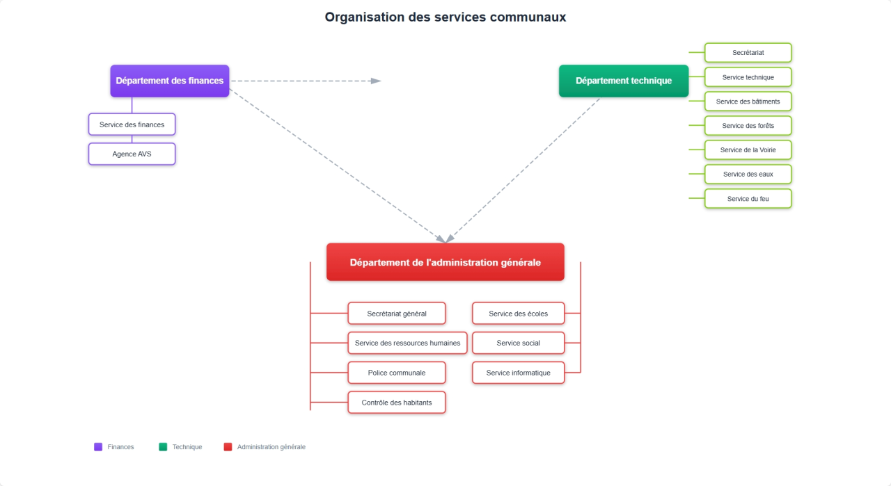 La Commune est organisée en trois départements (administration générale, technique et finances) qui sont subdivisés en services, selon l'organigramme ci-après.