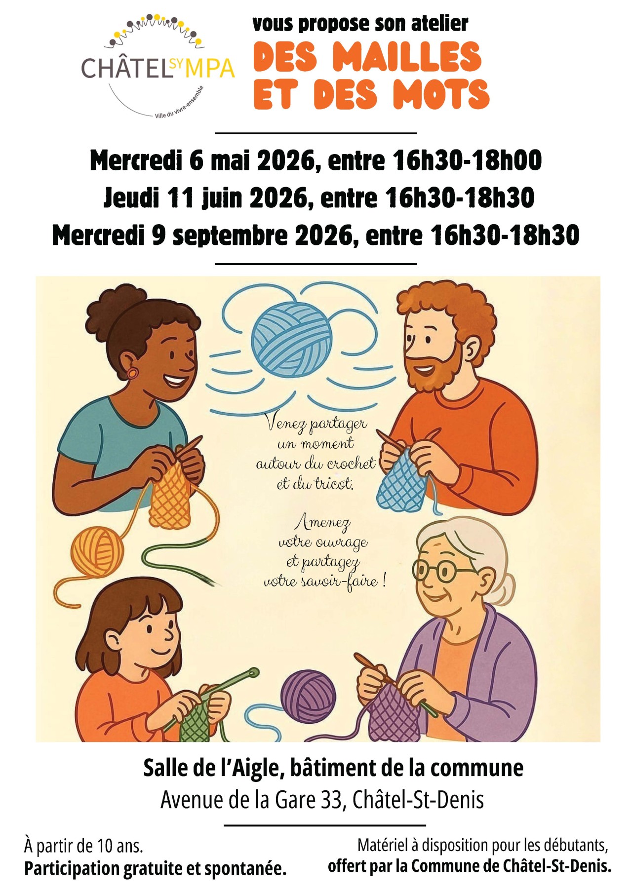 Atelier convivial et intergénérationnel, organisé par les Agent·e·s de Châtel Sympa, « Des mailles et des mots » invite toutes les personnes dès 10 ans à partager un moment autour du crochet et du tricot.
