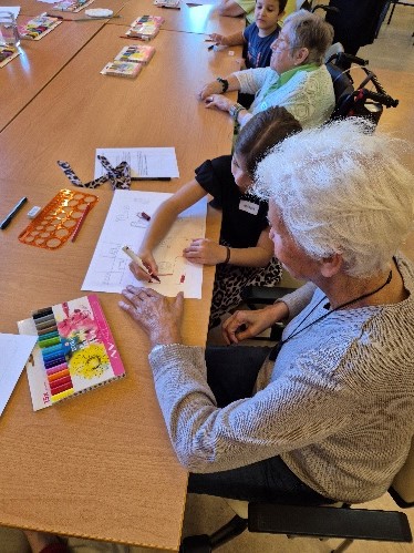 Durant l’année 2025, les deux groupes se sont rencontrés chaque mois pour échanger autour de thèmes tels que les jeux, l’école, les fêtes ou la musique. Les enfants ont posé leurs questions et, avec les aîné·e·s, ont illustré ces histoires au fil des rencontres, qui se terminaient toujours par un goûter convivial.
